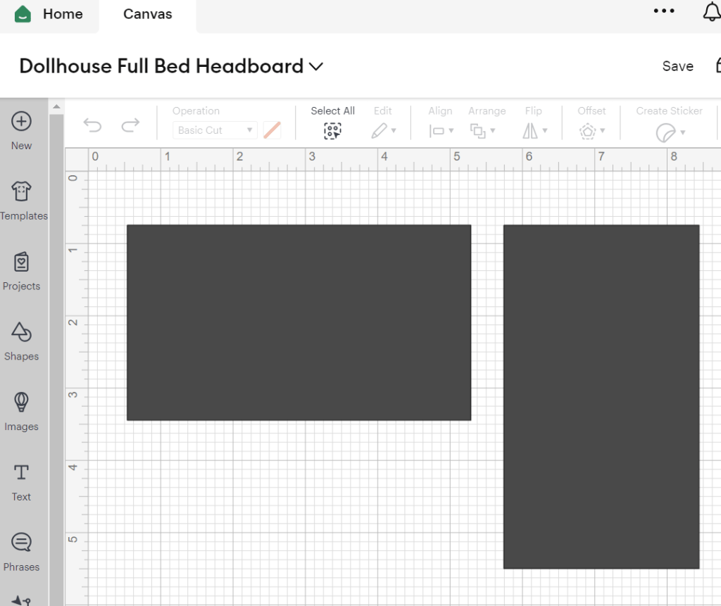 I created an SVG file in my Design Space to use with my Cricut Maker. For the headboard, I inverted the height and the width on the second rectangle so that one piece will be with the wood grain and one will be against the grain. (Just rotating it by 90 degrees in Design Space will not change how it is printed.)