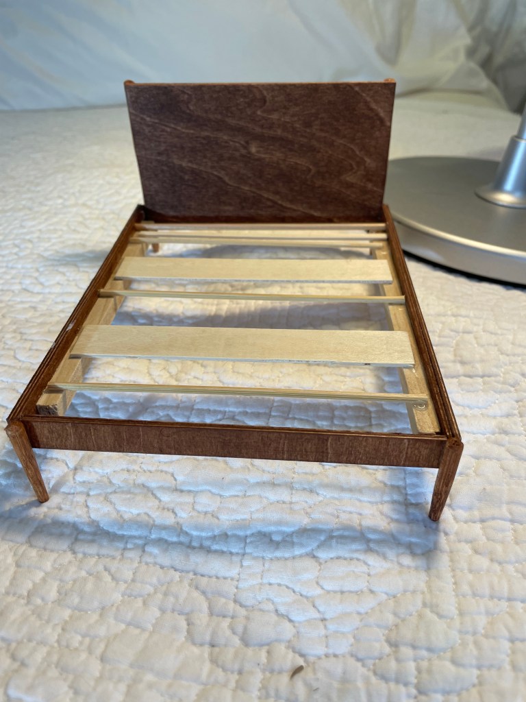 This 1:12 scale midcentury modern bed for A.’s house was inspired by West Elm’s Midcentury Bed in Acorn (link).