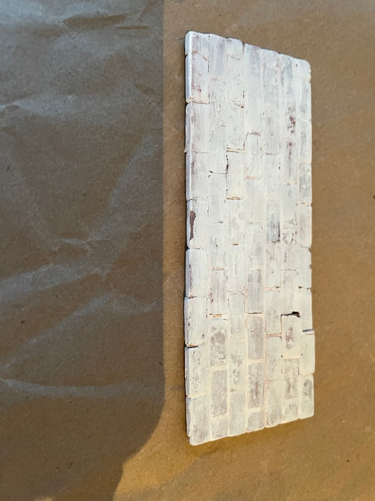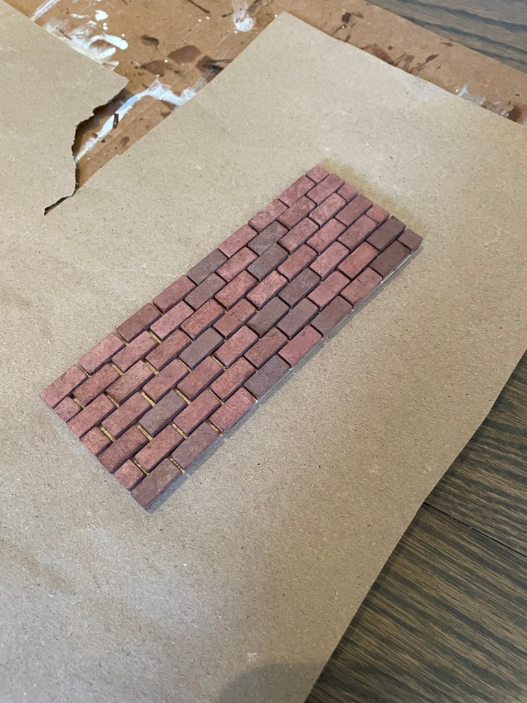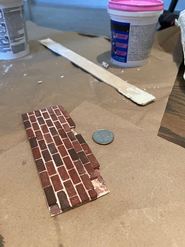 A few edge bricks that hadn’t been glued well came off in the grouting process, but those were easy to reapply later. I scraped as much of the excess grout off as I could with a scrap piece of basswood.