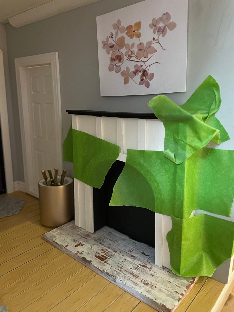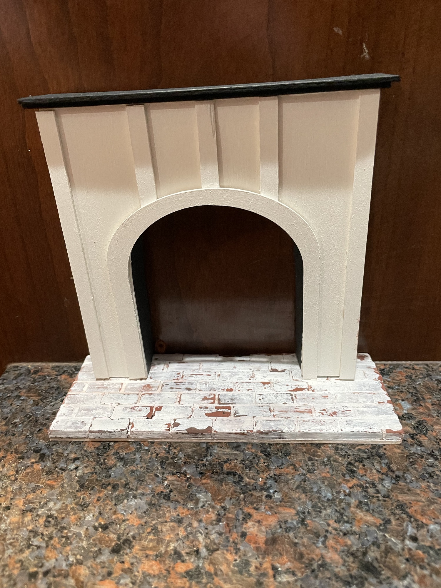 I used my Cricut Maker to cut all of the wood pieces out of 1/16 inch thick basswood sheets. I painted the mantel pieces black and the body and trim pieces white (which continues the color scheme from the outside of A’s house, see link).