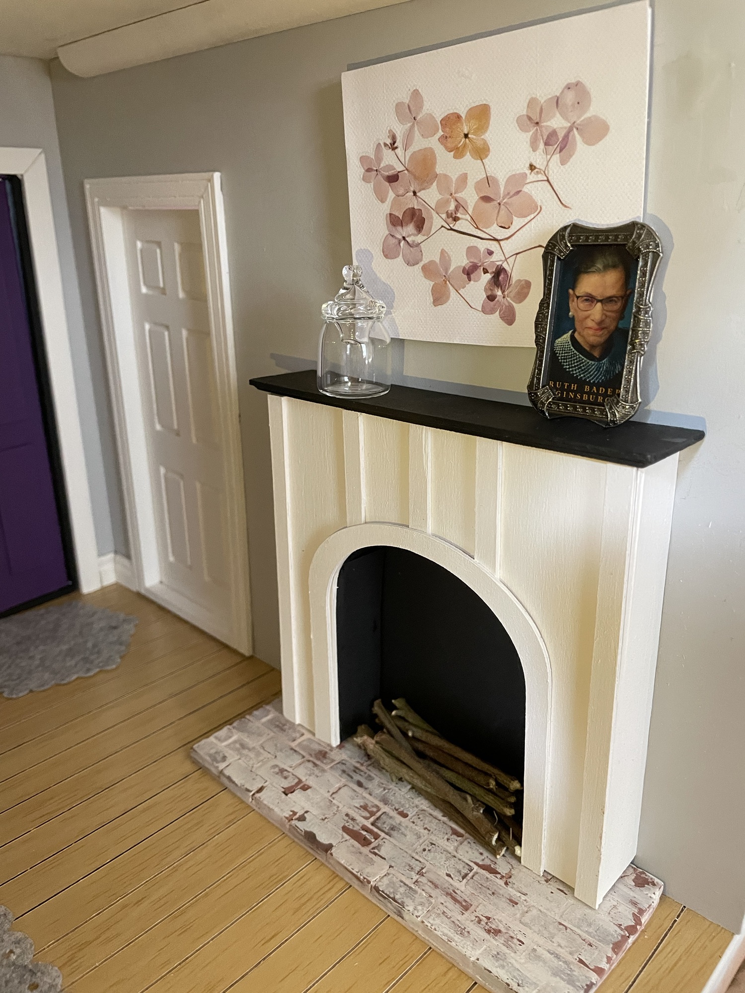 To make the hearth, I began with a rectangle of scrap basswood in the size that worked well in A’s living room. I spread Aleene’s craft glue on the wood and then carefully placed bricks in my desired pattern with a small gap for grouting. I let the glue dry overnight and then applied several coats of polyurethane spray.