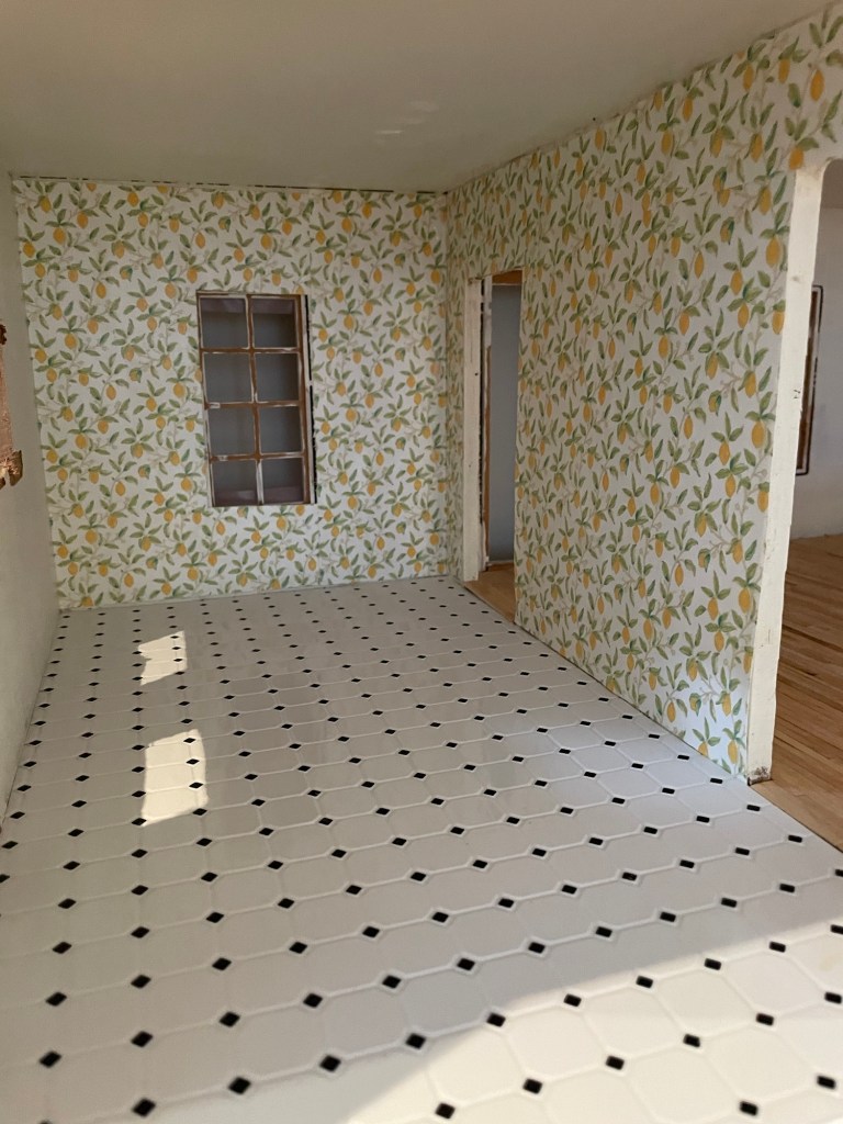 Here is a sneak peek of the kitchen in Luna’s house, with William Morris lemons wallpaper from LondonMiniature on etsy (link).