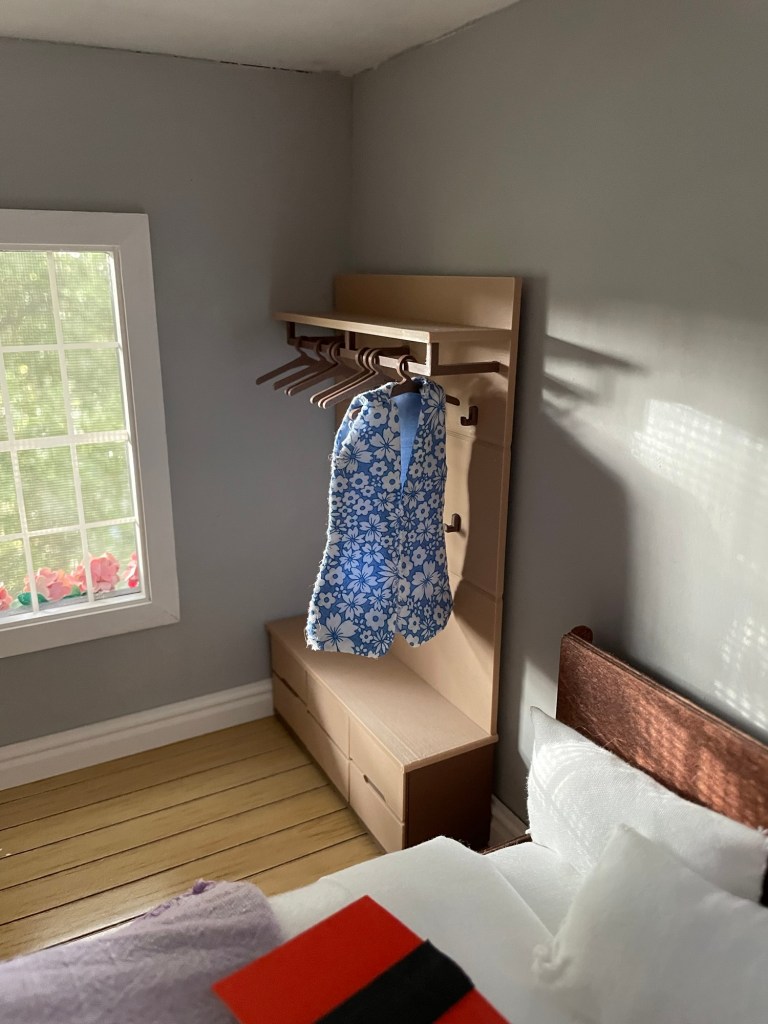 A favorite aspect of miniatures for me is getting to explore different types of crafts. As I wrap up some final details on A’s house, I decided to make some clothes to hang in the open wardrobe in the primary bedroom. I do not have a lot of expertise as a sewist, but I always like to improve my skills.