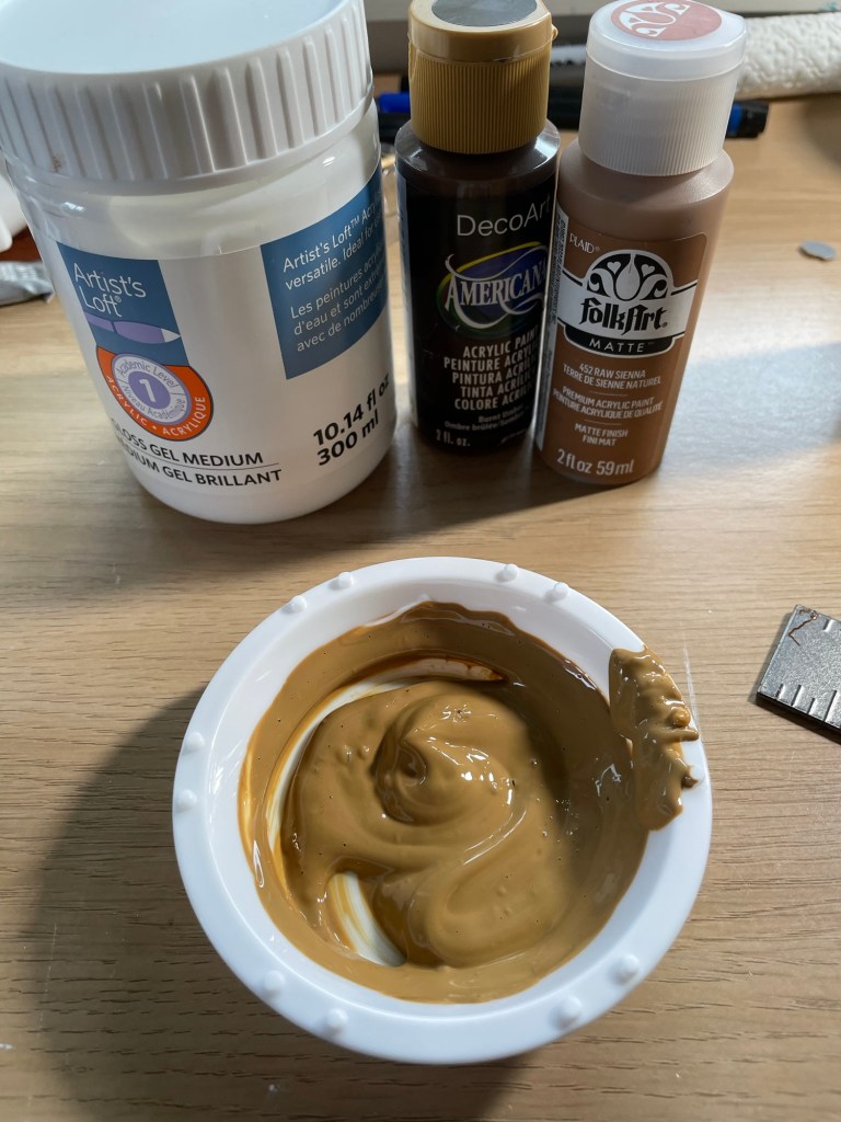 I sanded the rough edges and stained the planks with pine wood stain (link). When the resulting color was too light for me, I asked Grok and ChatGPT to suggest paint colors to mix with gel medium to get a darker shade. Both AI platforms suggested a combination of burnt umber and raw sienna. The darker hue added a lot of character!