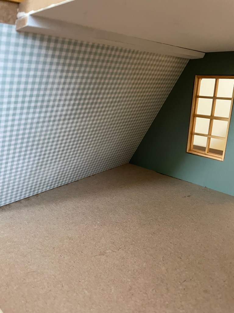 I attached the planks to the walls with the same non-water-based adhesive (link) that I use for dollhouse shingles so that the wood would not warp.